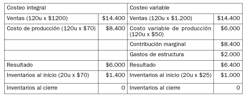 Al ser la venta mayor que la producción del período, los resultados por costeo variable son mayores que por costeo integral. La razón se encuentra en que en el costeo integral se muestra la totalidad de los costos de estructura de las unidades vendidas ($2400 = 120 u x $20), mientras que en el costeo variable solo están los gastos de estructura del mes ($2000).